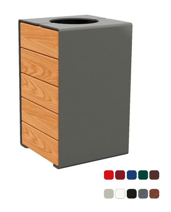 corbeille sofia sans couvercle – acier, bois (chêne clair certifié PEFC épaisseur 22 mm ou acajou) – capacité 120 Litres – contenance : porte sac recevant des sacs de 120 L (non fournis) – système d’ouverture : porte frontale , verrouillage par clé triangle – fixation par tiges d’ancrage -couleur RAL standard 1 – long. 450 x larg. 450 x haut. 750 mm