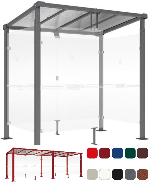 abri-fumeurs aron – poteaux tube acier 80×80 mm – cadre de toiture : deux traverses en tube acier 60×60 – toiture : panneau en polycarbonate alvéolaire translucide épaisseur 10 mm, traité anti-UV – bardages de façade, de côté, de fond : en verre sécurisé épaisseur 8 mm avec signalétique de sécurité – fixation bardage : système de pincement en zamak finition brossée – finition peinture RAL standard 1 – prof. 1824 x haut. 2606 mm – réf. abri-fumeurs long. 2500 mm