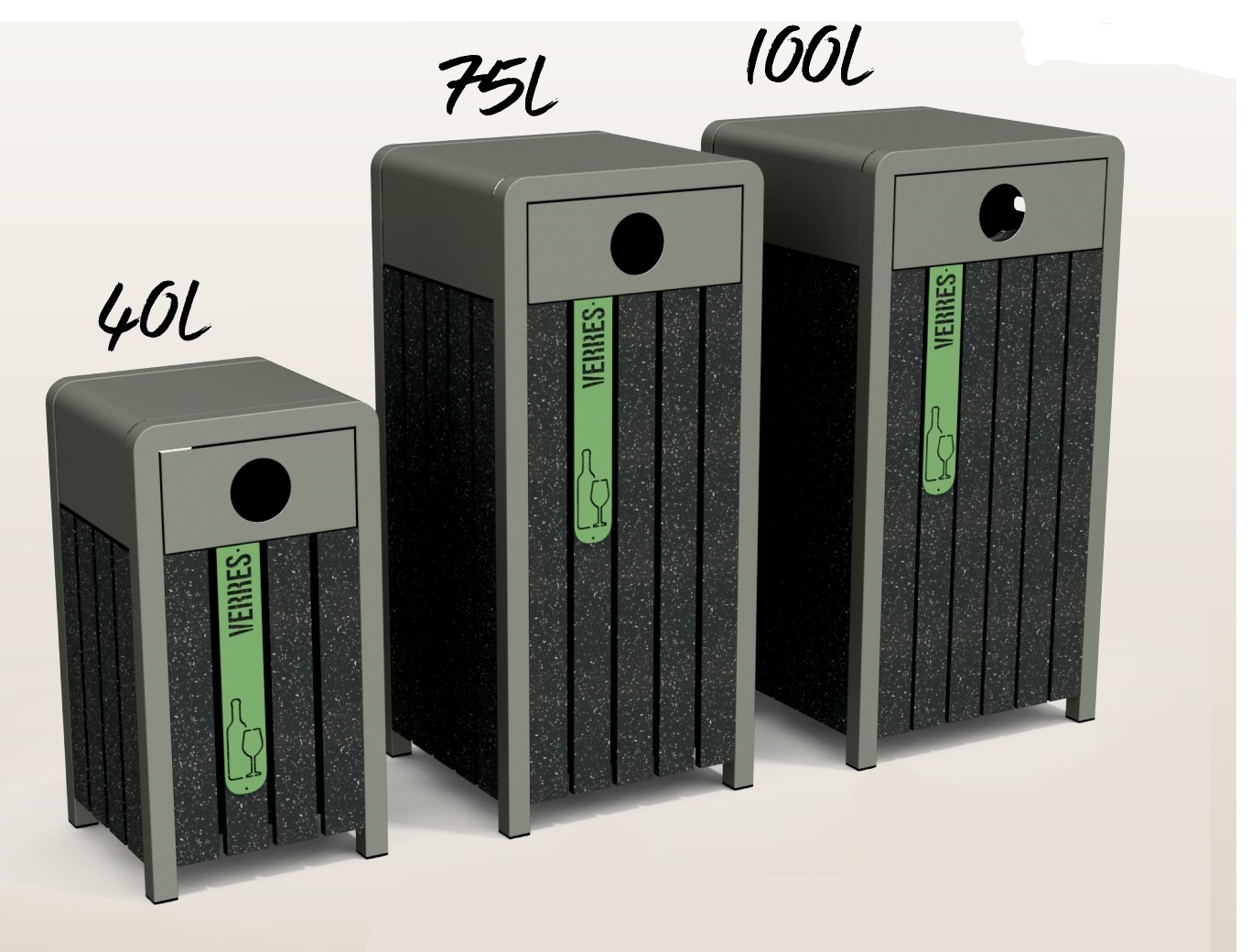 corbeille de propreté pour verre- structure aluminium avec lattes recyclées IRPA (issue des déchets plastiques et métalloplastiques) qui permet une grande résistance aux intempéries – inoxydable – finition aluminium laqué RAL standard 2 – système d’ouverture avec 2 clapets – 40 L Haut. 755 x Larg. 400 x Prof. 400 mm