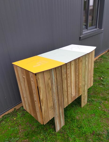 199,99 €corbeille tri-sélectif tri-flux 3 x 100 L pin traité autoclave classe IV – portes latérales démontables – fermeture par batteuse – visserie acier galvanisé – pied et traverses section 22×90 mm – couvercle en compact avec motif au choix gravé jaune (recyclable), vert (verre), blanc (non recyclable) à sceller ou à poser – long. 1230 x Prof. 520 x haut. 750 mm