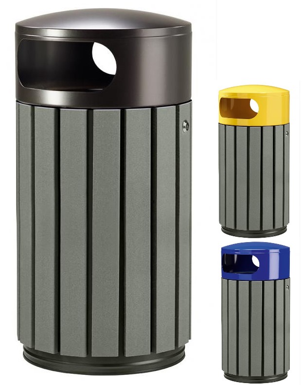 Corbeille orleans 80 L – Conception : Acier galvanisé – Finitions : Peinture polyester labellisée – haute résistance – traitement anticorrosif – anti UV – Dimensions : Ø 42 cm x H 87 cm – Volumes : 80 Litres – Support sac ou seau en option – Fermeture : Serrure automatique – Fixation : A sceller ou à poser – Poids : 20 kg – RAL : 7016 / 3020 / 9005 / 6005 / 5002 / 5015 / 1023