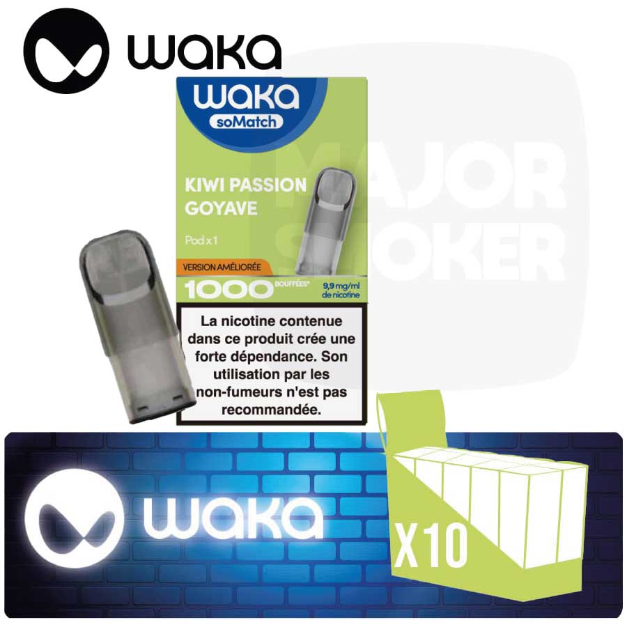 Découvrez le lot de 10 pods, Waka SoMatch au gout kiwi passion goyave avec un taux de nicotine de 9,9mg/ml.